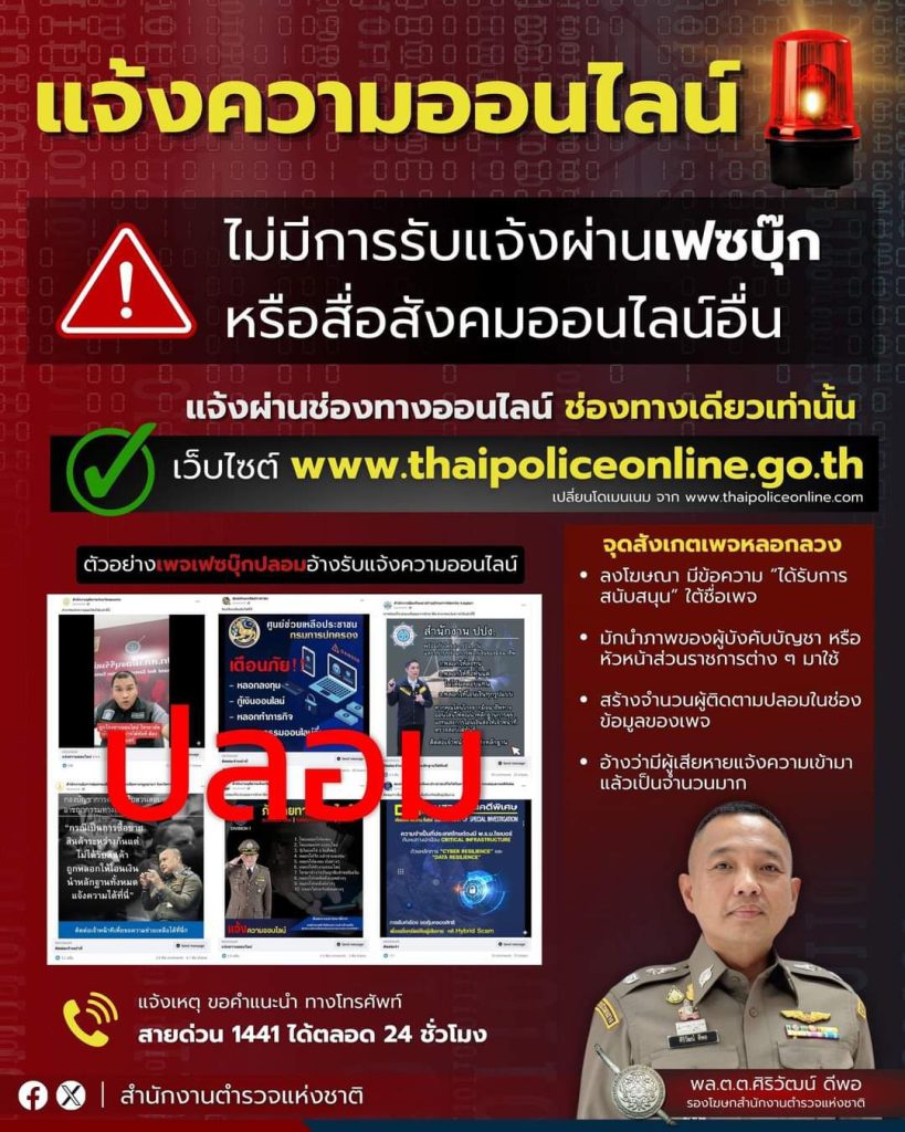 เมื่อวันที่ 31 ธันวาคม 2566 พล.ต.ต.ศิริวัฒน์ ดีพอ รองโฆษกสำนักงานตำรวจแห่งชาติ กล่าวว่า พล.ต.อ.ต่อศักดิ์ สุขวิมล ผบ.ตร. ได้มีความห่วงใยพี่น้องประชาชนที่อาจได้รับความเสียหายจากอาชญากรรมรูปแบบต่าง ๆ ซึ่งในปัจจุบันได้มีกลุ่มมิจฉาชีพที่อาศัยการสร้างเพจเฟซบุ๊กปลอมพร้อมมีการลงโฆษณา อ้างเป็น สำนักงานตำรวจแห่งชาติ หรือหน่วยงานราชการอื่น ระบุข้อความว่าสามารถแจ้งความออนไลน์ได้ที่บัญชีสื่อสังคมออนไลน์ดังกล่าว ซึ่งไม่เป็นความจริง และมีการหลอกลวงเอาทรัพย์สินโดยการอ้างว่าเป็นค่าดำเนินการ ค่าเร่งรัดคดีเป็นกรณีพิเศษ หรือเป็นวิธีการที่จะทำให้ได้เงินคืนจากคนร้าย โดยหลอกให้เข้าลงทุนในเว็บไซต์หลอกลงทุนหรือหลอกให้เข้าเล่นเว็บไซต์พนันออนไลน์ ทำให้มีพี่น้องประชาชนหลงเชื่อได้รับความเสียหายเป็นจำนวนมาก